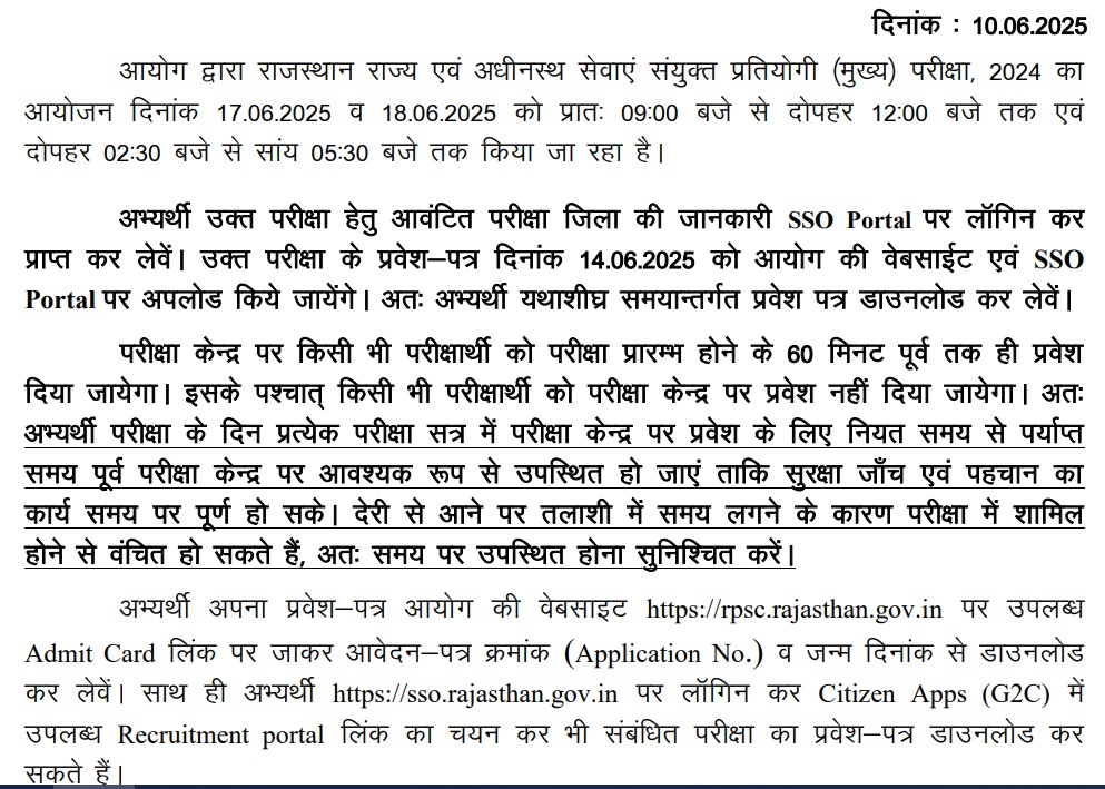 आरपीएससी की ओर से आरएएस, आरटीएस मेंस परीक्षा का आयोजन राज्यभर में निर्धारित परीक्षा केंद्रों पर 17 एवं 18 जून 2025 को करवाया जायेगा। परीक्षा दो शिफ्ट में संपन्न करवाई जाएगी। प्रथम पाली की परीक्षा सुबह 9 बजे से लेकर दोपहर 12 बजे तक एवं दूसरी पाली की परीक्षा अपरान्ह 2:30 बजे से शाम 5:30 बजे तक आयोजित करवाई जाएगी।